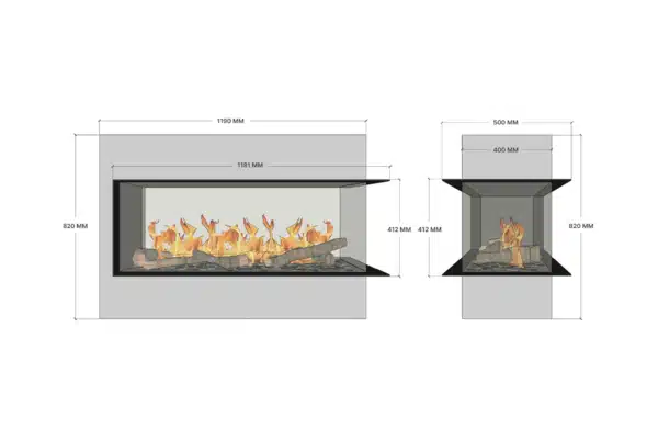 Met een diepte van 400 mm biedt deze haard een indrukwekkend vlammenspel, zichtbaar vanuit meerdere hoeken, waardoor hij ideaal is als eyecatcher in de ruimte.